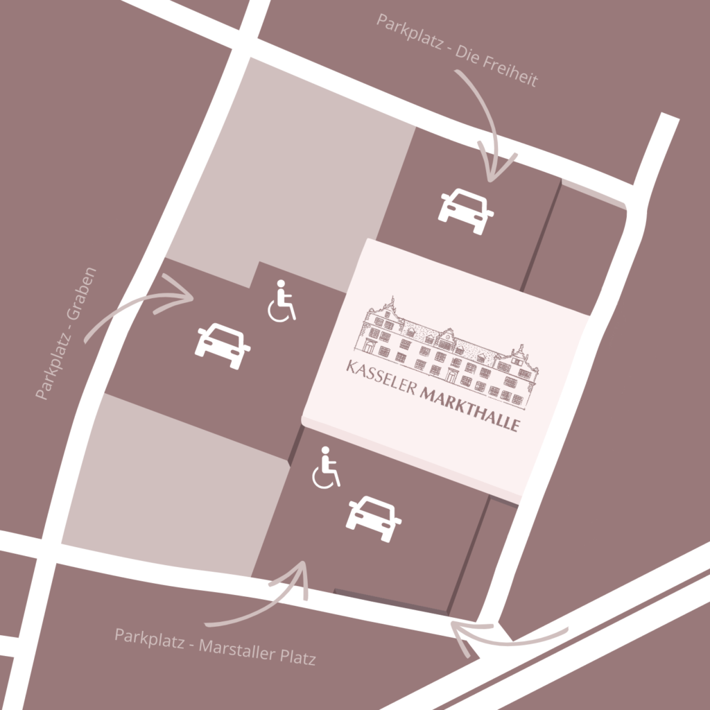Für Ihren Komfort bietet die Markthalle Kassel drei zentrale Parkmöglichkeiten: "Marställer", "Graben" und "Freiheit". Damit Sie Ihre Einkäufe nicht weit tragen müssen, sind diese Parkplätze ideal gelegen.