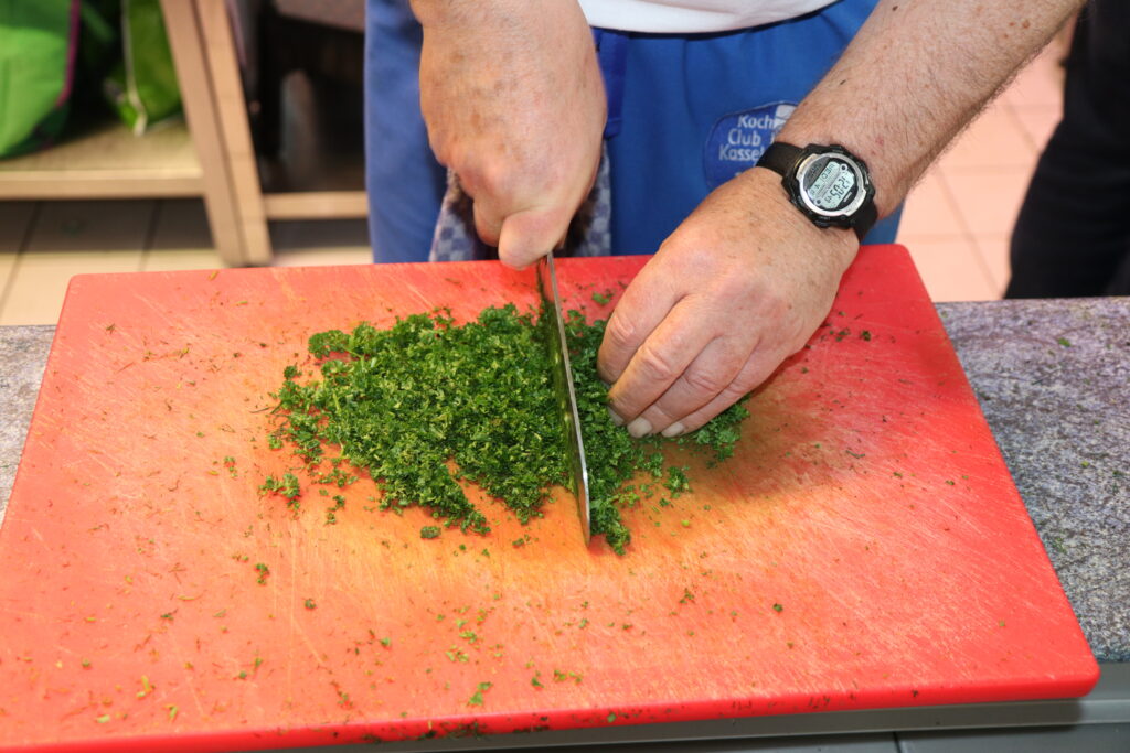 Kiloweise Borretsch, Petersilie, Pimpinelle, Schnittlauch, Sauerampfer, Zitronenmelisse und Dill schneiden die Mitglieder des Koch Club Kassel in winzige Schnipsel — die Grundlage, für etwa 150 Liter Grüne Soße, die am Gründonnerstag und Ostersamstag den Markthallen-Besuchern angeboten wird.